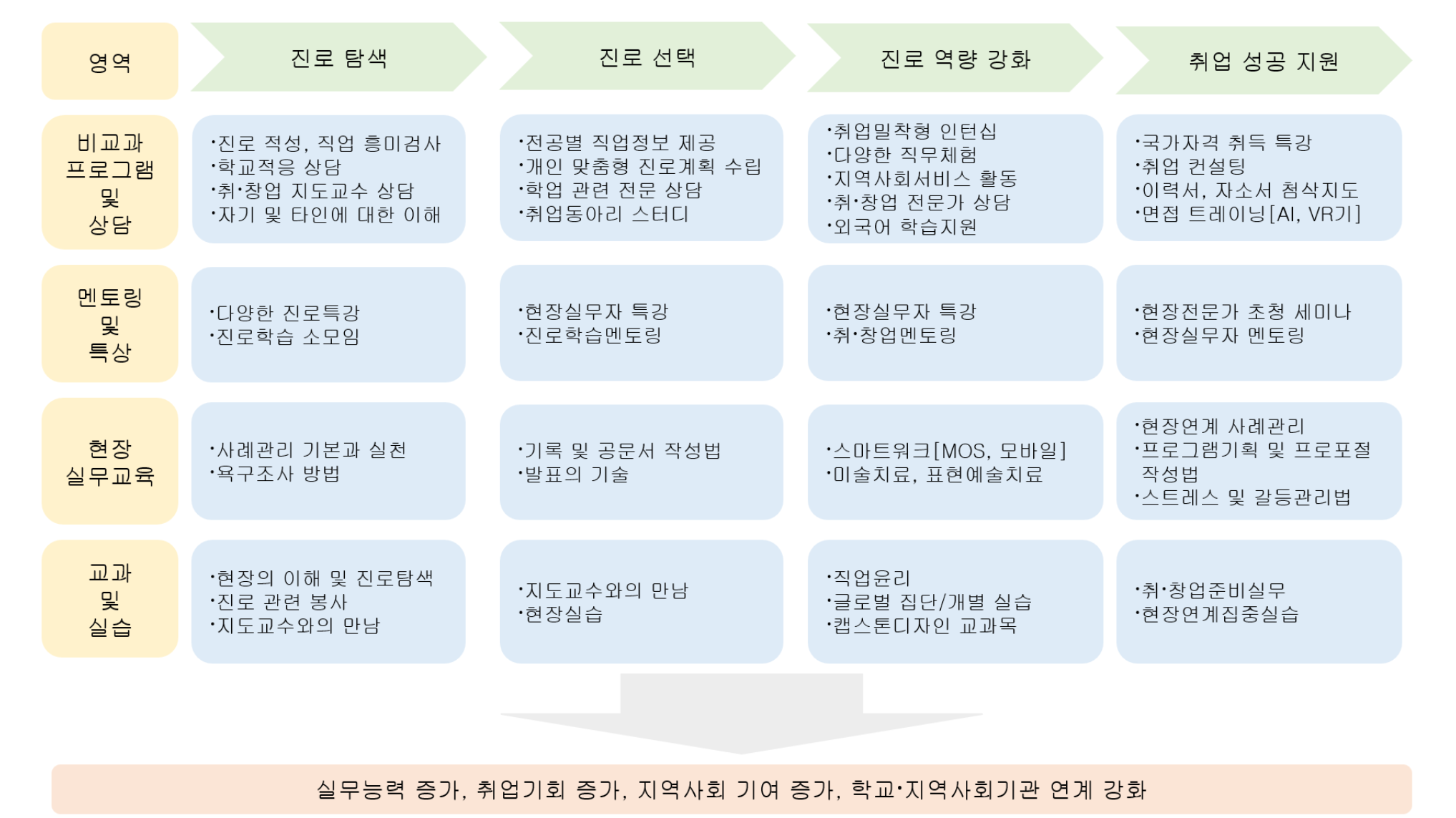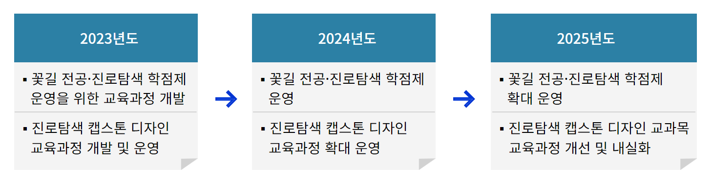 • 꽃길 전공·진로탐색 학점제 : 교과-비교과 프로그램 및 현장실무교육-캡스톤디자인 교과목 연계 등 학생이 전공 및 진로탐색을 실행하고 학점으로 인정 받게 함